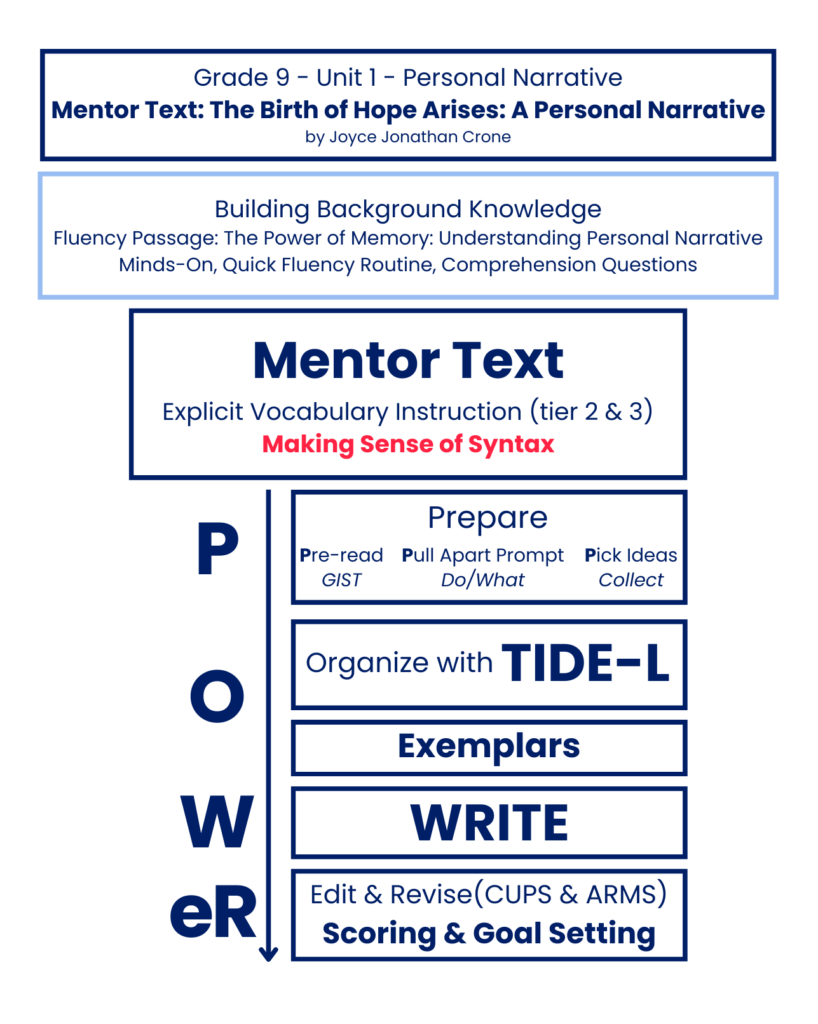 Through the thinkSRSD writing cycle, students learn how to analyze a strong personal narrative, generate ideas from their own lives, plan using the TIDE structure, and craft a clear and meaningful story of a single event. With the mentor text, exemplars, vocabulary routine, and guided practice, students build both the skill and confidence needed to express their authentic voice on the page.